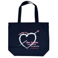 ブルーインパルス人気課目 キューピット トートバッグ。4番機がハートを射抜きます。サイズ 横48×縦40×マチ15cm。 持手 幅2.5×長さ60cm。 容量19リットル。 綿100% 紺地。
