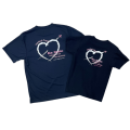 大人用速乾タイプ 子供用は綿100%ブルーインパルスの人気課目Cupid背中にはチームが作ったハートに4番機が矢になって射抜く図。前面は左胸にブルーインパルスのインシグニアがワンポイント。一番下のJASDF AEROBATIC TEAMの文字が大人用は白、キッズはピンクになっています。サイズは大人S~3L。速乾タイプ。キッズサイズは110・130・150の3サイズ。生地は綿100%